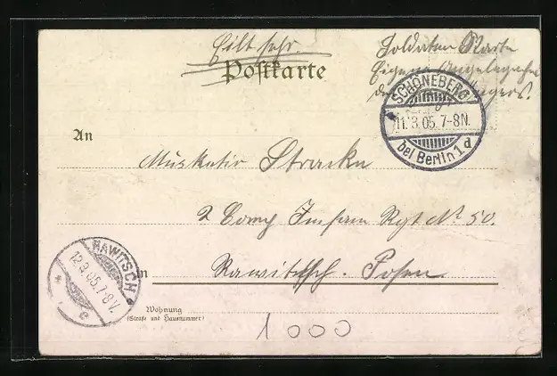 Personenbezogene Daten auf der Rückseite der Karte wurden durch blauen Textmarker unkenntlich gemacht. Die blauen Stellen sind auf die Vorderseite durchgeweicht und wirken sich negativ auf das Postkartenfoto aus