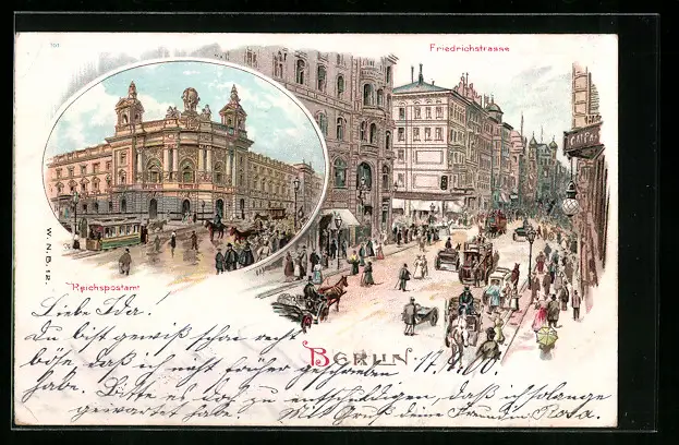 Lithographie Berlin, Die Friedrichstrasse und das Reichspostamt