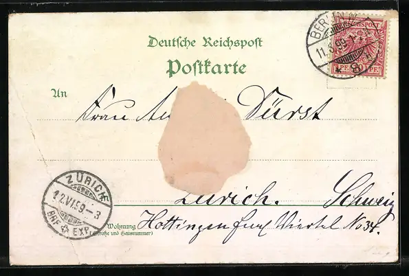 gelaufen 1899, rückseitig Klebe- und Papierreste, Bugspur unten re., Eckknick unten li., Einriss unten Mitte, guter Zustand