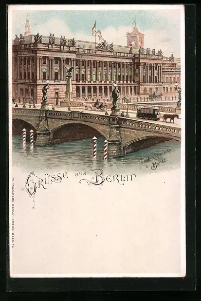 Lithographie Berlin, Friedrichsbrücke und Börse mit Pferdebahn, Burgstrasse