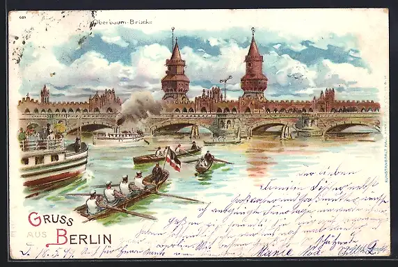 Lithographie Berlin-Friedrichshain, Oberbaum-Brücke mit Spree