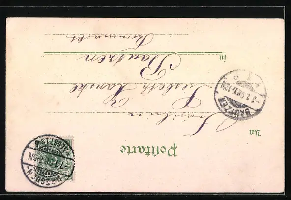 Personenbezogene Daten auf der Rückseite der Karte wurden durch blauen Textmarker unkenntlich gemacht. Die blauen Stellen sind auf die Vorderseite durchgeweicht und wirken sich negativ auf das Postkartenfoto aus