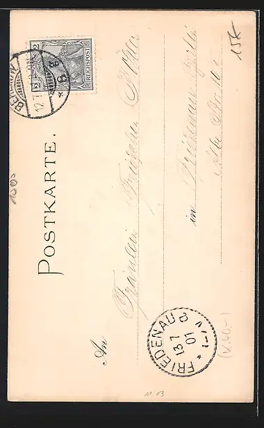 Personenbezogene Daten auf der Rückseite der Karte wurden durch blauen Textmarker unkenntlich gemacht. Die blauen Stellen sind auf die Vorderseite durchgeweicht und wirken sich negativ auf das Postkartenfoto aus