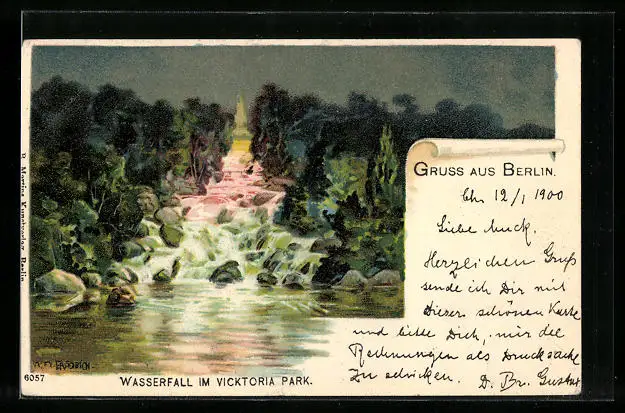Lithographie Berlin, Illuminierter Wasserfall im Vicktoria Park