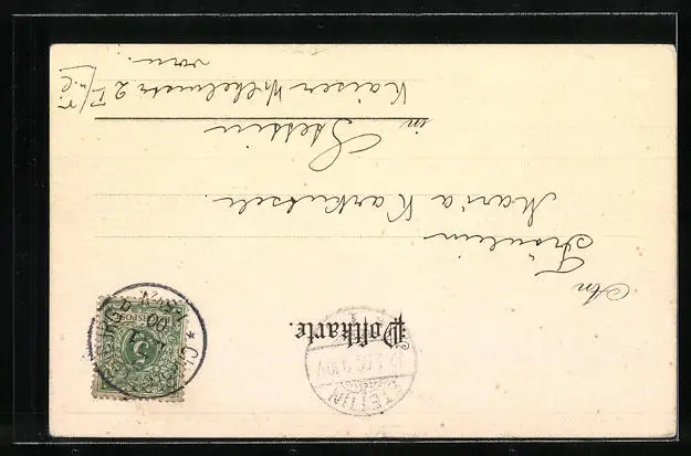 Personenbezogene Daten auf der Rückseite der Karte wurden durch blauen Textmarker unkenntlich gemacht. Die blauen Stellen sind auf die Vorderseite durchgeweicht und wirken sich negativ auf das Postkartenfoto aus