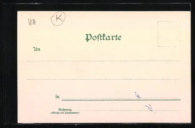 Personenbezogene Daten auf der Rückseite der Karte wurden durch blauen Textmarker unkenntlich gemacht. Die blauen Stellen sind auf die Vorderseite durchgeweicht und wirken sich negativ auf das Postkartenfoto aus