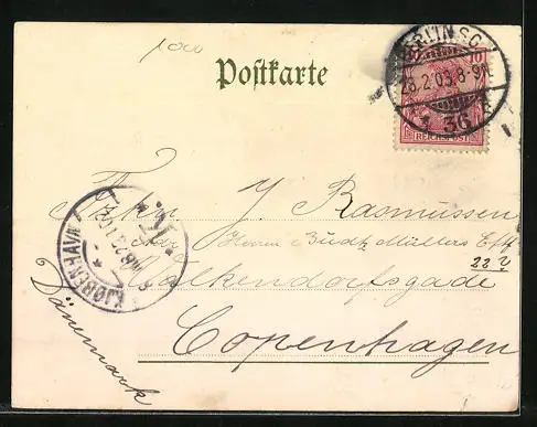 Personenbezogene Daten auf der Rückseite der Karte wurden durch blauen Textmarker unkenntlich gemacht. Die blauen Stellen sind auf die Vorderseite durchgeweicht und wirken sich negativ auf das Postkartenfoto aus