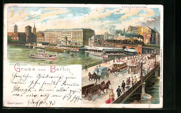 Lithographie Berlin, Jannowitzbrücke mit Dampfschiffen