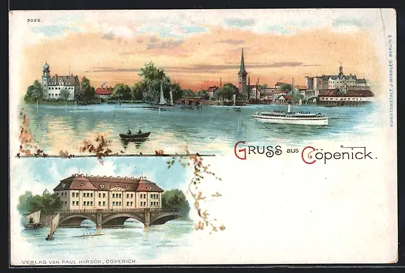 Lithographie Berlin-Köpenick, Uferpartie mit Dampfer, Brücke
