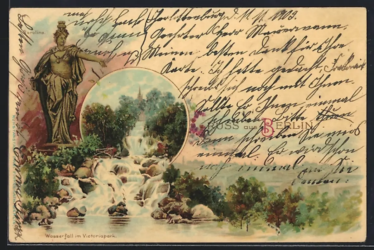 Lithographie Berlin-Kreuzberg, Wasserfall im Viktoriapark, Statue