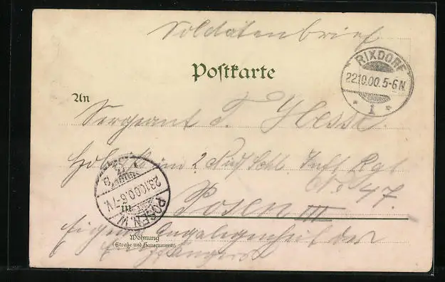 Personenbezogene Daten auf der Rückseite der Karte wurden durch blauen Textmarker unkenntlich gemacht. Die blauen Stellen sind auf die Vorderseite durchgeweicht und wirken sich negativ auf das Postkartenfoto aus