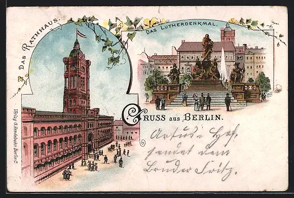 Lithographie Berlin, Lutherdenkmal, Neuer Markt, Rathaus