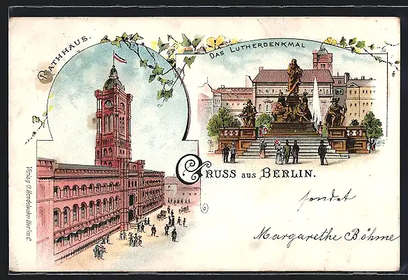Lithographie Berlin, Lutherdenkmal, Neuer Markt, Rotes Rathaus