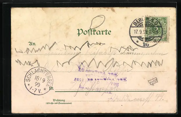 Personenbezogene Daten auf der Rückseite der Karte wurden durch blauen Textmarker unkenntlich gemacht. Die blauen Stellen sind auf die Vorderseite durchgeweicht und wirken sich negativ auf das Postkartenfoto aus