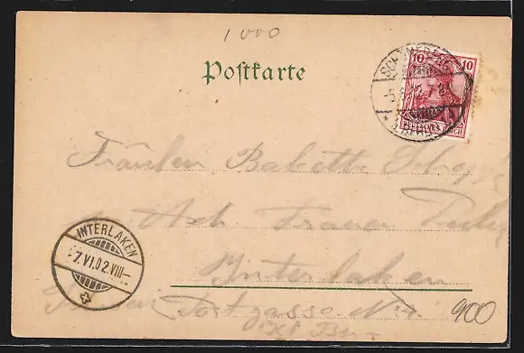 Personenbezogene Daten auf der Rückseite der Karte wurden durch blauen Textmarker unkenntlich gemacht. Die blauen Stellen sind auf die Vorderseite durchgeweicht und wirken sich negativ auf das Postkartenfoto aus