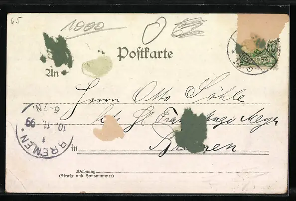 Personenbezogene Daten auf der Rückseite der Karte wurden durch blauen Textmarker unkenntlich gemacht. Die blauen Stellen sind auf die Vorderseite durchgeweicht und wirken sich negativ auf das Postkartenfoto aus