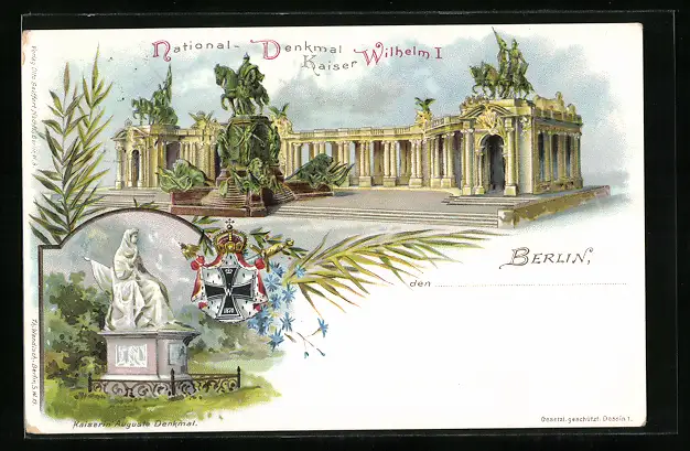 Lithographie Berlin, National-Denkmal Kaiser Wilhelm I. Kaiserin Auguste Denkmal, Ganzsache