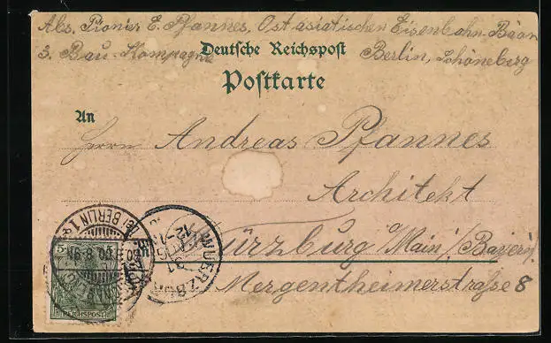 Personenbezogene Daten auf der Rückseite der Karte wurden durch blauen Textmarker unkenntlich gemacht. Die blauen Stellen sind auf die Vorderseite durchgeweicht und wirken sich negativ auf das Postkartenfoto aus