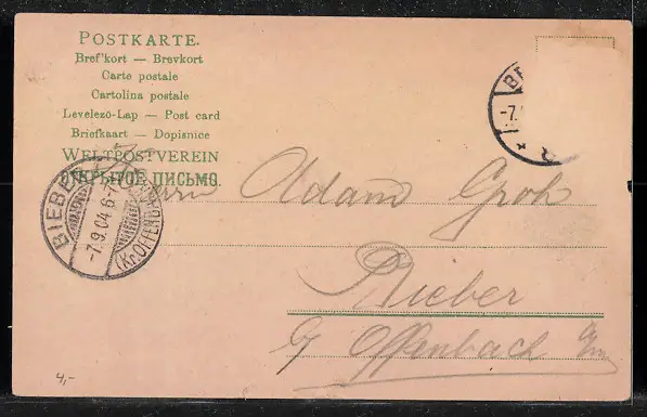 Personenbezogene Daten auf der Rückseite der Karte wurden durch blauen Textmarker unkenntlich gemacht. Die blauen Stellen sind auf die Vorderseite durchgeweicht und wirken sich negativ auf das Postkartenfoto aus
