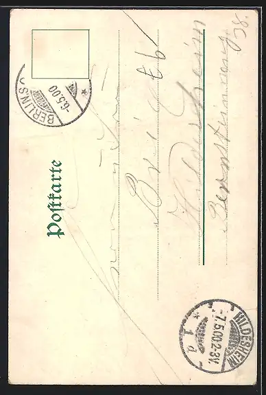 Personenbezogene Daten auf der Rückseite der Karte wurden durch blauen Textmarker unkenntlich gemacht. Die blauen Stellen sind auf die Vorderseite durchgeweicht und wirken sich negativ auf das Postkartenfoto aus