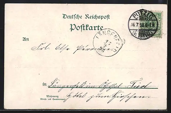 Personenbezogene Daten auf der Rückseite der Karte wurden durch blauen Textmarker unkenntlich gemacht. Die blauen Stellen sind auf die Vorderseite durchgeweicht und wirken sich negativ auf das Postkartenfoto aus