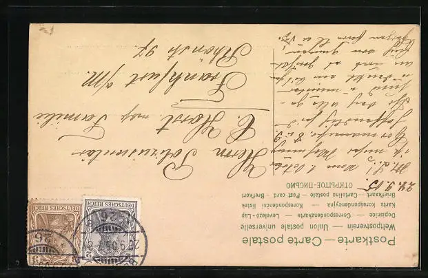 Personenbezogene Daten auf der Rückseite der Karte wurden durch blauen Textmarker unkenntlich gemacht. Die blauen Stellen sind auf die Vorderseite durchgeweicht und wirken sich negativ auf das Postkartenfoto aus