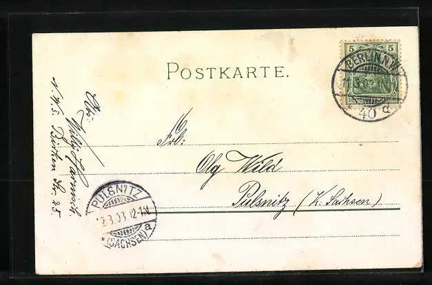 Personenbezogene Daten auf der Rückseite der Karte wurden durch blauen Textmarker unkenntlich gemacht. Die blauen Stellen sind auf die Vorderseite durchgeweicht und wirken sich negativ auf das Postkartenfoto aus