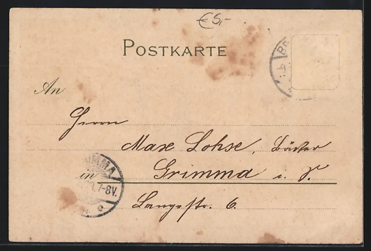 Personenbezogene Daten auf der Rückseite der Karte wurden durch blauen Textmarker unkenntlich gemacht. Die blauen Stellen sind auf die Vorderseite durchgeweicht und wirken sich negativ auf das Postkartenfoto aus