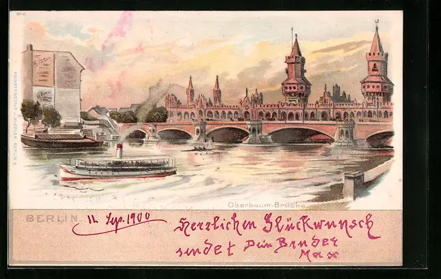 Lithographie Berlin, Oberbaum-Brücke, Dampfer