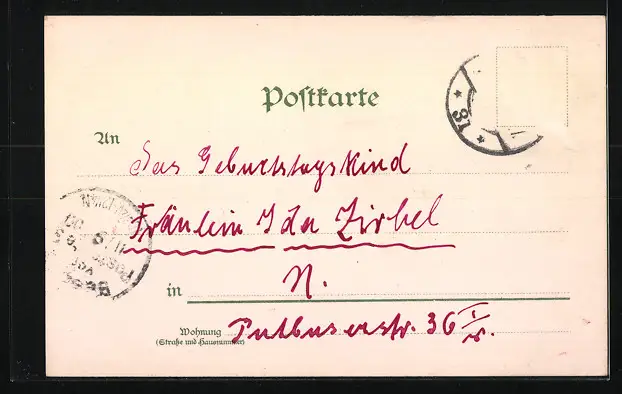 Personenbezogene Daten auf der Rückseite der Karte wurden durch blauen Textmarker unkenntlich gemacht. Die blauen Stellen sind auf die Vorderseite durchgeweicht und wirken sich negativ auf das Postkartenfoto aus