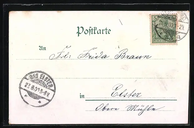Personenbezogene Daten auf der Rückseite der Karte wurden durch blauen Textmarker unkenntlich gemacht. Die blauen Stellen sind auf die Vorderseite durchgeweicht und wirken sich negativ auf das Postkartenfoto aus