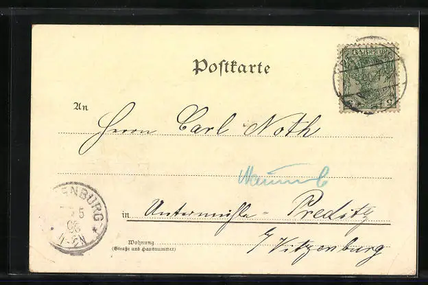 Personenbezogene Daten auf der Rückseite der Karte wurden durch blauen Textmarker unkenntlich gemacht. Die blauen Stellen sind auf die Vorderseite durchgeweicht und wirken sich negativ auf das Postkartenfoto aus
