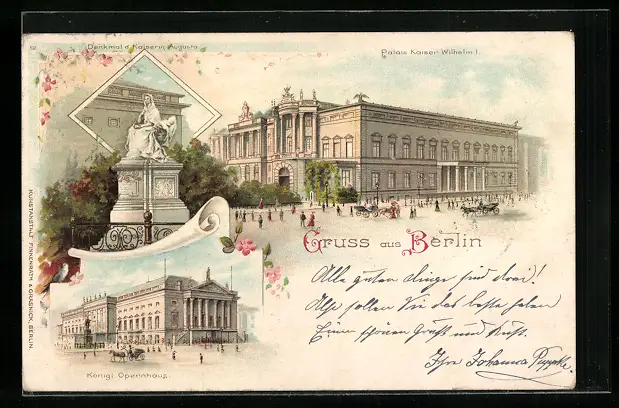 Lithographie Berlin, Palais Kaiser Wilhelm I, Denkmal d. Kaiserin Augusta, Königl. Opernhaus
