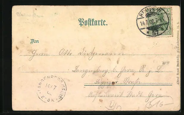 Personenbezogene Daten auf der Rückseite der Karte wurden durch blauen Textmarker unkenntlich gemacht. Die blauen Stellen sind auf die Vorderseite durchgeweicht und wirken sich negativ auf das Postkartenfoto aus