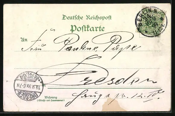 gelaufen 1899, Eckknick unten rechts, rückseitig Oberflächenschaden, Abriebspur unten mittig, guter Zustand