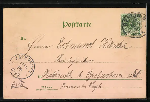 gelaufen 1899, Eckknick oben li., guter Zustand