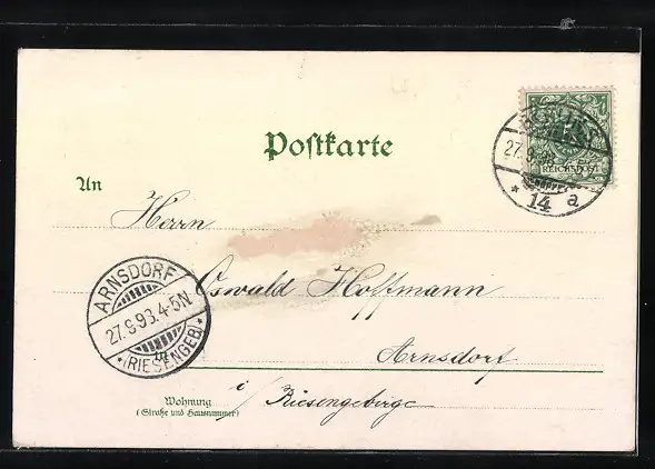 Personenbezogene Daten auf der Rückseite der Karte wurden durch blauen Textmarker unkenntlich gemacht. Die blauen Stellen sind auf die Vorderseite durchgeweicht und wirken sich negativ auf das Postkartenfoto aus