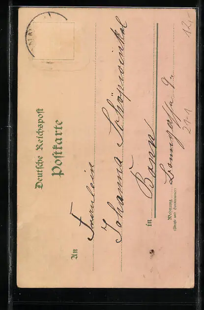 Personenbezogene Daten auf der Rückseite der Karte wurden durch blauen Textmarker unkenntlich gemacht. Die blauen Stellen sind auf die Vorderseite durchgeweicht und wirken sich negativ auf das Postkartenfoto aus