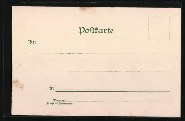 Personenbezogene Daten auf der Rückseite der Karte wurden durch blauen Textmarker unkenntlich gemacht. Die blauen Stellen sind auf die Vorderseite durchgeweicht und wirken sich negativ auf das Postkartenfoto aus