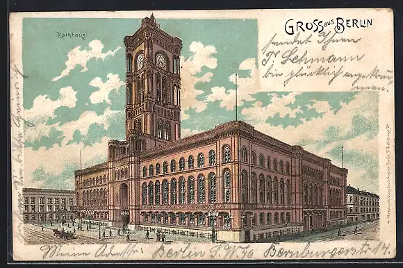 Lithographie Berlin, Rathaus mit Strassenpartie