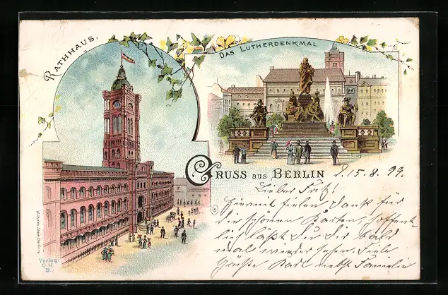 Lithographie Berlin, Rathaus und Lutherdenkmal, Neuer Markt