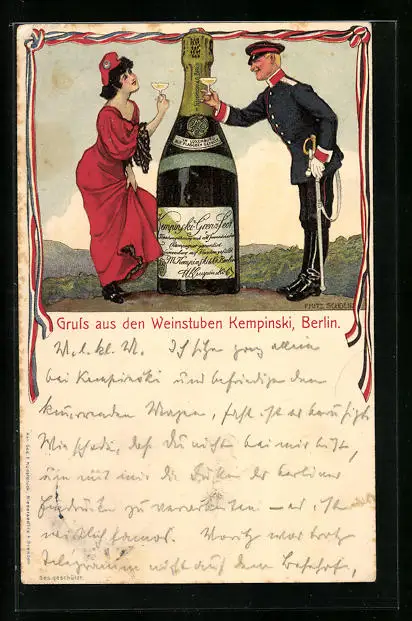 Lithographie Berlin, Restaurant Kempinski, Mann und Dame stossen mit Sekt an