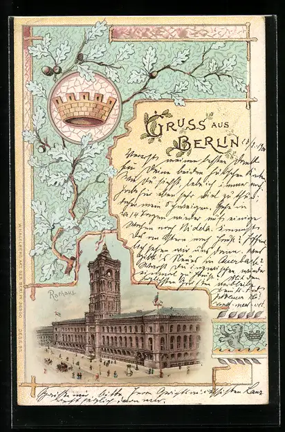 Lithographie Berlin, Rotes Rathaus, Krone in Eichenlaub, Königstrasse
