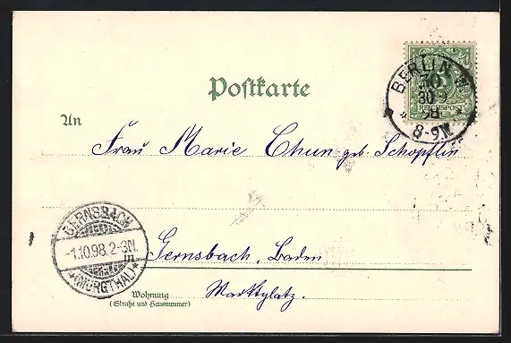 Personenbezogene Daten auf der Rückseite der Karte wurden durch blauen Textmarker unkenntlich gemacht. Die blauen Stellen sind auf die Vorderseite durchgeweicht und wirken sich negativ auf das Postkartenfoto aus