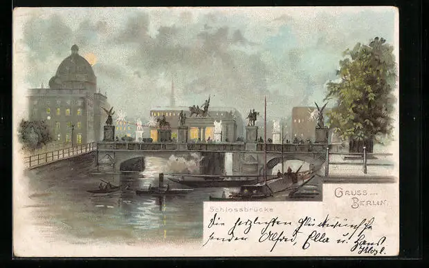 Lithographie Berlin, Schlossbrücke bei Vollmond