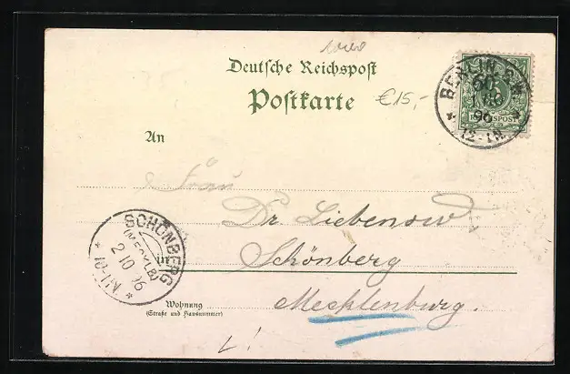Personenbezogene Daten auf der Rückseite der Karte wurden durch blauen Textmarker unkenntlich gemacht. Die blauen Stellen sind auf die Vorderseite durchgeweicht und wirken sich negativ auf das Postkartenfoto aus