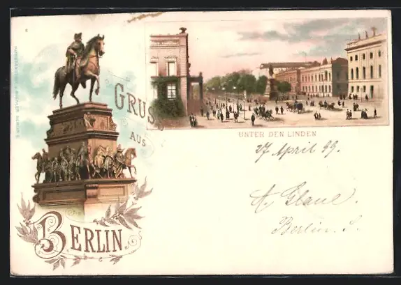 Lithographie Berlin, Strasse Unter den Linden mit Denkmal