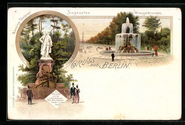 Lithographie Berlin-Tiergarten, Lessing-Denkmal, Siegesallee, Wrangelbrunnen
