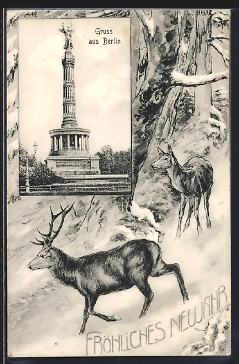 Lithographie Berlin-Tiergarten, Siegessäule, Hirsch im Winterwald, Neujahr