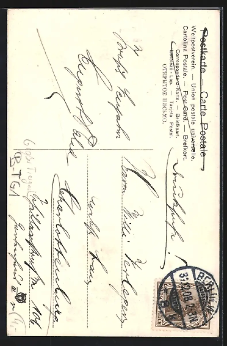 Personenbezogene Daten auf der Rückseite der Karte wurden durch blauen Textmarker unkenntlich gemacht. Die blauen Stellen sind auf die Vorderseite durchgeweicht und wirken sich negativ auf das Postkartenfoto aus